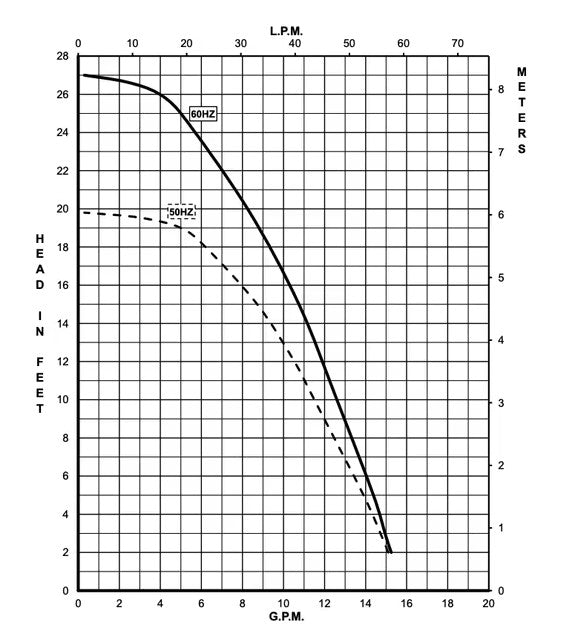 CTM industrial PM1000LH is an American submersible seal-less centrifugal magnetic drive pump. It is capable of generating a maximum flow of 15 gallons per minute at 2 feet, and its maximum head is 27 Feet (or around 11PSI). The PM1000LH pump may be used submerged or not submerged. The standard wet end (the materials that come into contact with the solution) is composed of Polypropylene, Buna N, Stainless Steel, Ceramic, and Ceramic Magnet. When submerged, Epoxy, Noryl, and the Cord are also in contact with the solution. The inlet connection is 1 inch female pipe thread, and the outlet is 1/2 inch male pipe thread. The standard motor is a 1 Phase 115V or 230V 0.125 Horsepower motor, which can be run on either 50 or 60 hertz (there are performance differences between the hertz options). Direct replacement for Dometic PML1000 230V Part.